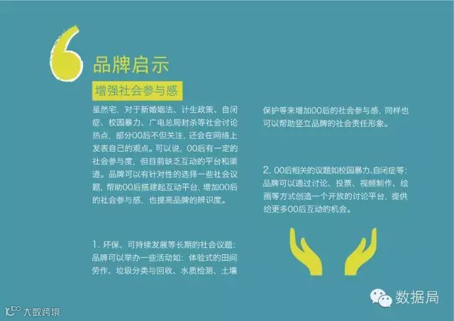 品牌启示:虽然宅,对于新婚姻法、计生政策、自闭症、校园暴力、广电总局封杀等社会讨论热点,部分00后不但关注,还会在网络上发表自己的观点。可以说,00后有一定的社会参与度,但目前缺乏互动的平台和渠道。品牌可以有针对性的选择一些社会议题,帮助00后搭建起互动平台,增加00后的社会参与感,也提高品牌的辨识度。