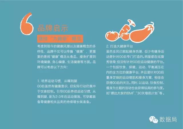 打造大健康平台,虽然全民已掀起健身热潮,但少有健身运动是针对00后专门打造的。明星都在炫腹秀锁骨,但没有针对00后运动健康的平台。一个包括饮食、保健、运动、平衡减压在内的全方位的健康平台,并且是针对00后量身定做的运动增肌和瘦身方案,相信会获得00后的关注。 同时,以运动、饮食控制、瘦身为主题的活动也会获得较高的参与度。如“晒出大家的BMI”, “30天增肌计划”等 。