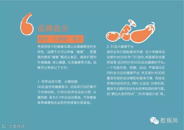 品牌启示:考虑到现今的健康风潮以及健康概念的多样性,品牌不仅可以传播“健康”,更重要的是将“ 健康”概念从食品、瘦身扩展到环境健康、身心健康、生活健康等方面。品牌可以考虑以下方向: