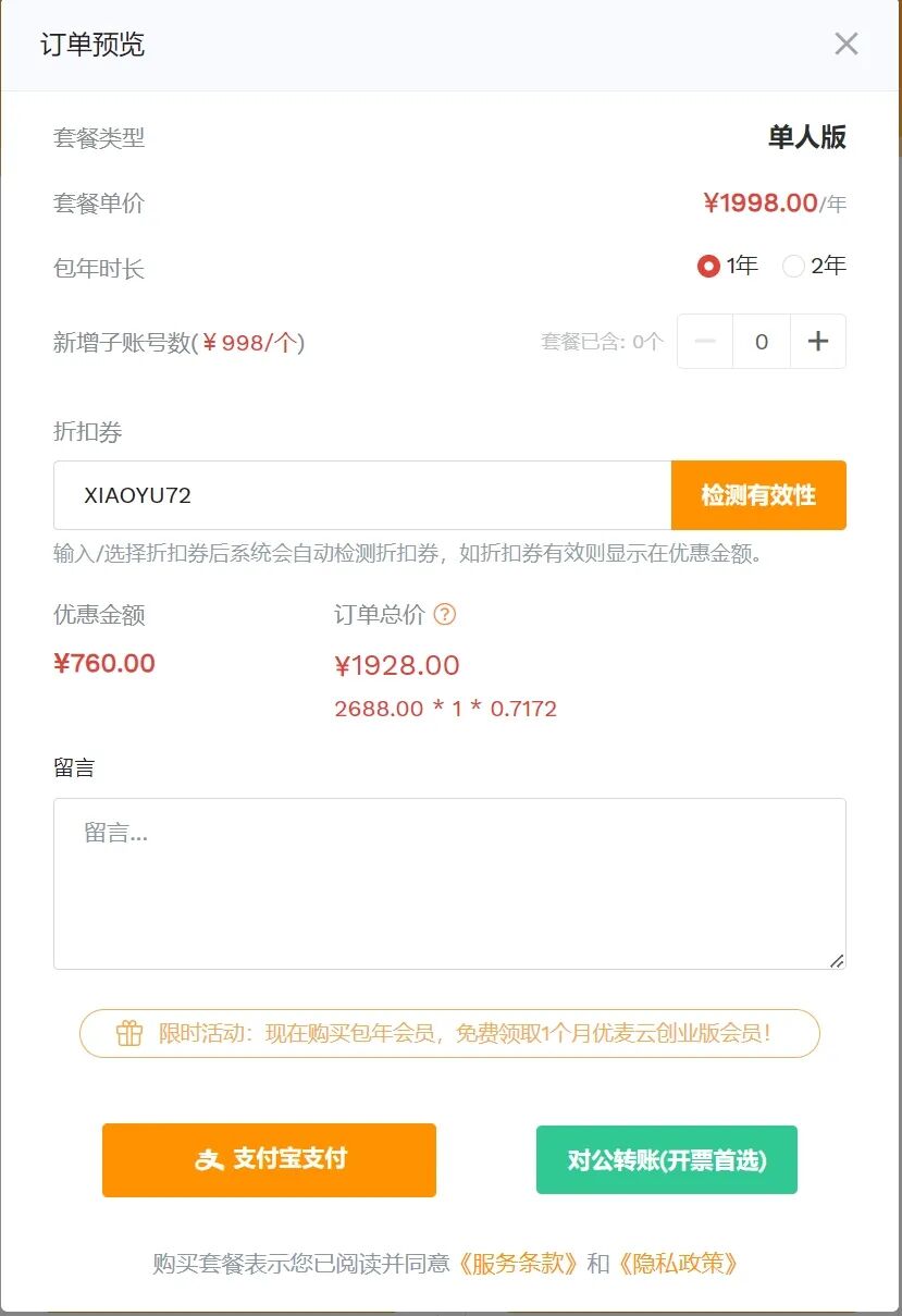 购买卖家精灵套餐时,选择支付宝/对公账户购买 ,再输入对应的折扣码,点击检测有效性即可享受优惠