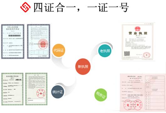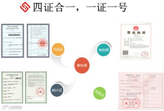 2015年10月1日起,营业执照、组织机构代码证和税务登记证三证合一。以后不管是新企业还是老企业,只发一个证书,也叫营业执照,不再发税务登记证、机构代码证和统计证了。除此之外,还有一个“号”,就是18位的统一社会信用代码号,这个号为终身制。