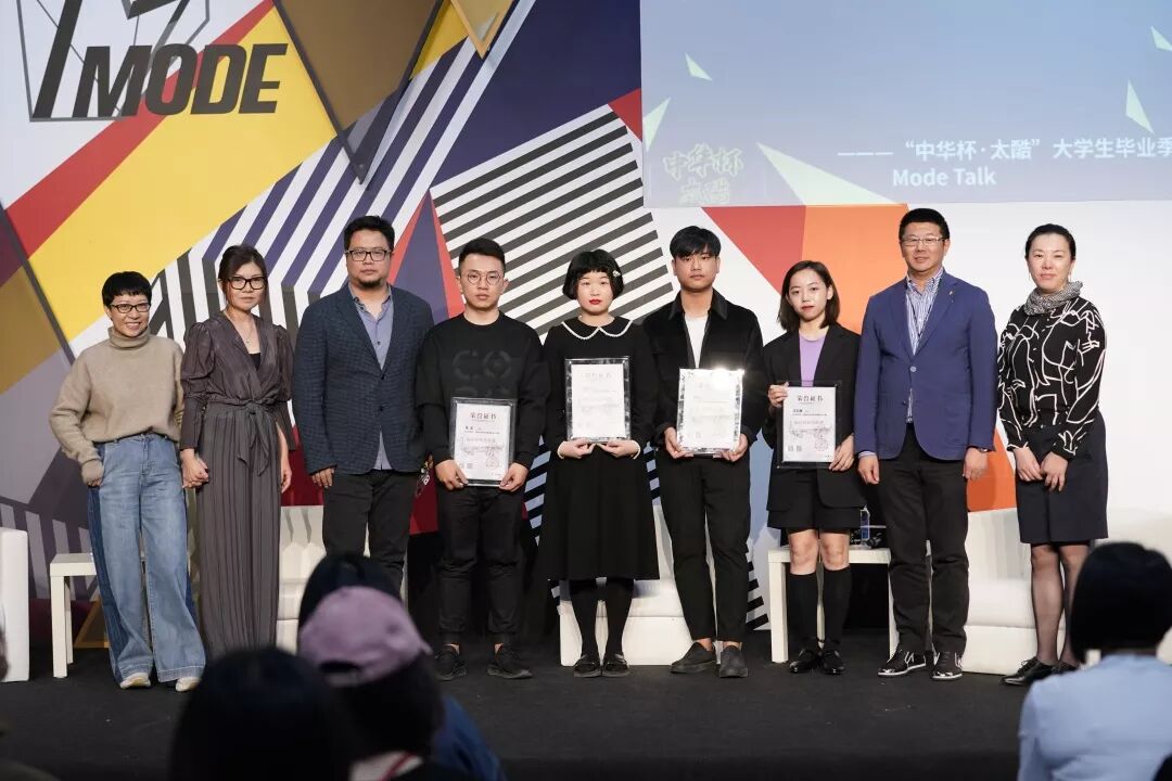 MODE TALK 的论坛现场五位嘉宾:上海时装周组委会副秘书长、中华杯大学生毕业季服装设计大赛组委会邵峰、TORAY WANG 创始人王陶、XIAO CHONG 创始人小虫、以及中华杯大赛组委会执行副主任,同济大学校董,易城股份董事长毛蔚瀛、上海国际时尚教育中心总经理吕雯俊作为颁奖嘉宾为在2018年赛季获得“最佳商业价值奖”的五位获奖选手颁奖。