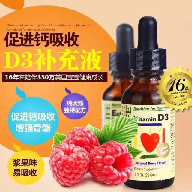 ChildLife美国进口维生素D3补充液特别为婴儿和儿童所配制,是6个月婴儿就可以食用,促进钙的吸收,口感佳。ChildLife维生素D3是特别为婴儿和儿童所配制,不含酒精,全天然的成分,天然浆果美味,最适宜吸收。