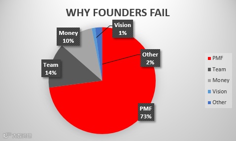 你可以看到上面的这个饼状图,分别以各种颜色代表了初创公司失败原因。很明显,失败的最大原因就是来自于产品市场契合点(PMF)。尽管现在有成千上万篇文章都在谈论 PMF 有多么的重要,但是我们仍然能够看到在这个点上犯错的公司数量高的惊人!
