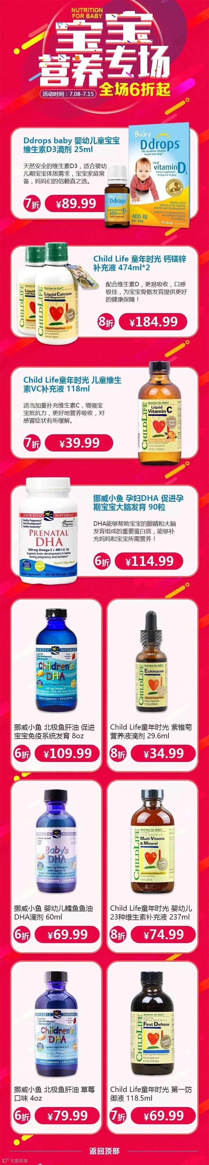 7月8日---15日,宝宝营养专场低至6折!维生素、钙镁锌、DHA应有尽有!从促进宝宝健康,增强免疫力,提升大脑发育等各个方面为宝宝的健康成长全方位护航!
