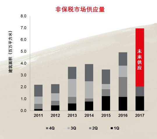 2017年下半年,我们预计全国非保税市场供应量将增加近500万平方米。一些供应较为集中的城市如重庆、成都、武汉等,租金或继续承压,而其他目前供需平衡的城市,其租金将有所增长或保持平稳,而需求强劲但供给缺乏的核心城市如北京、深圳等,租金仍有进一步上涨的空间。