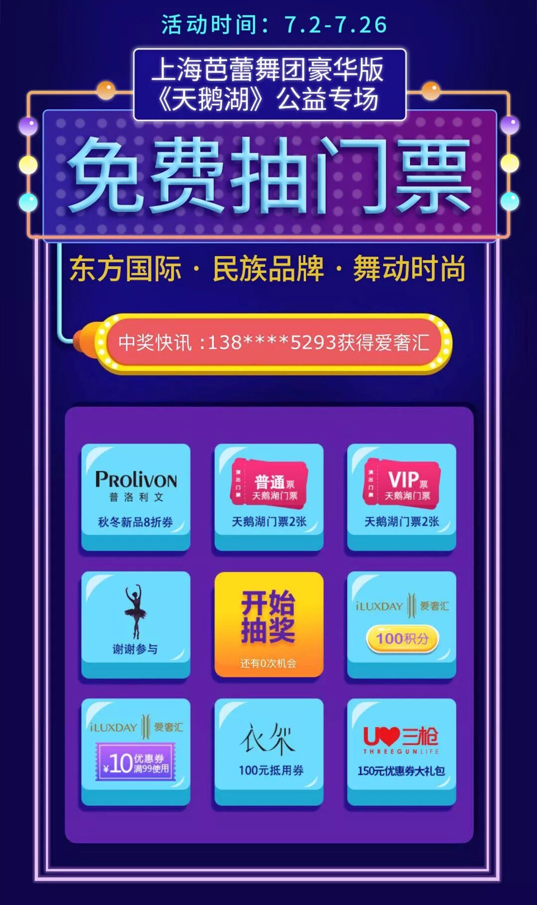 登陆爱奢汇 APP,每天都有机会免费抽取豪华版《天鹅湖》门票 2 张!更有机会被 Prolivon 新品 8 折券、三枪 150 元优惠券大礼包、衣架 100 元抵用券幸运砸中!