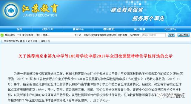 8月上旬,江苏省教育厅体卫艺处就拟推荐申报2017年全国校园篮球特色学校名单进行公示。