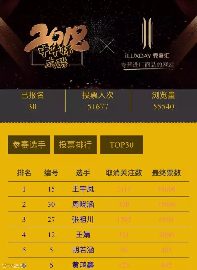 爱奢汇 x 2018 中华杯•太酷「最佳人气奖」线上投票活动终于落下帷幕,6 位人气选手分别是王宇凤、周晓涵、张祖川、王婧、胡若涵、黄鸿鑫。