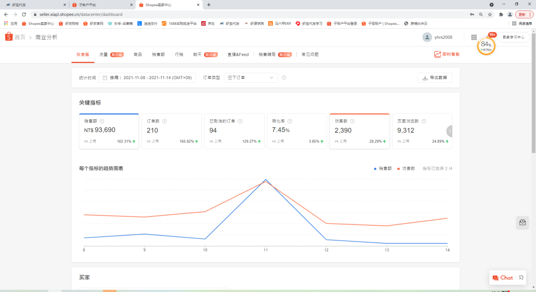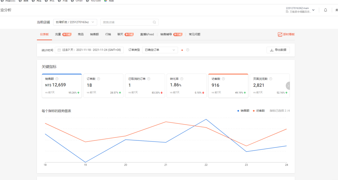 首先我们最先关注的是日期来判断时间点,可以看见是双11的日子,那么我们可以判断出在这天的全平台大促下带来的流量福利推动我们的销量以及访客等。