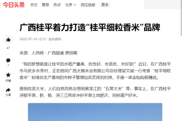 通过官方媒体的舆论引导,依托传统媒体的公信力与影响力,确保内容的真实性和可靠性,以“北有五常大米,南有桂平细粒香米”、“南方的大米,桂平细粒香米”作为传播主旨,塑造高可信度的南方中高端大米品牌形象。