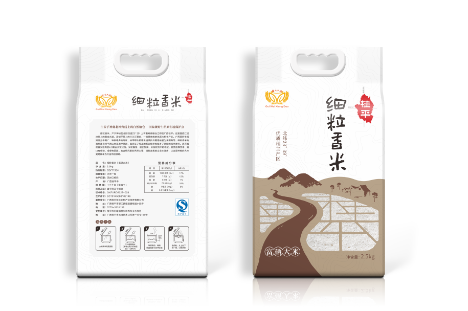我们的团队为“桂平细粒香米”设计了专有的字体,并且抛弃传统的图形标志,直接以字为形,搭配“桂平”印章形成logo,确保形象独特性和识别度高效统一。