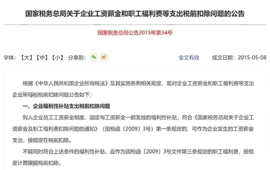 根据国家税务总局公告2015年第34号,第一条的规定,列入企业员工工资薪金制度、固定与工资薪金一起发放的福利性补贴,符合《国家税务总局关于企业工资薪金和职工福利费等支出税前扣除问题的公告》(国税函〔2009〕3号)第一条规定的,可作为企业发生的工资薪金支出,按规定在税前扣除。不能同时符合上述条件的福利性补贴,应作为国税函〔2009〕3号文件第三条规定的职工福利费,按规定计算限额税前扣除。
