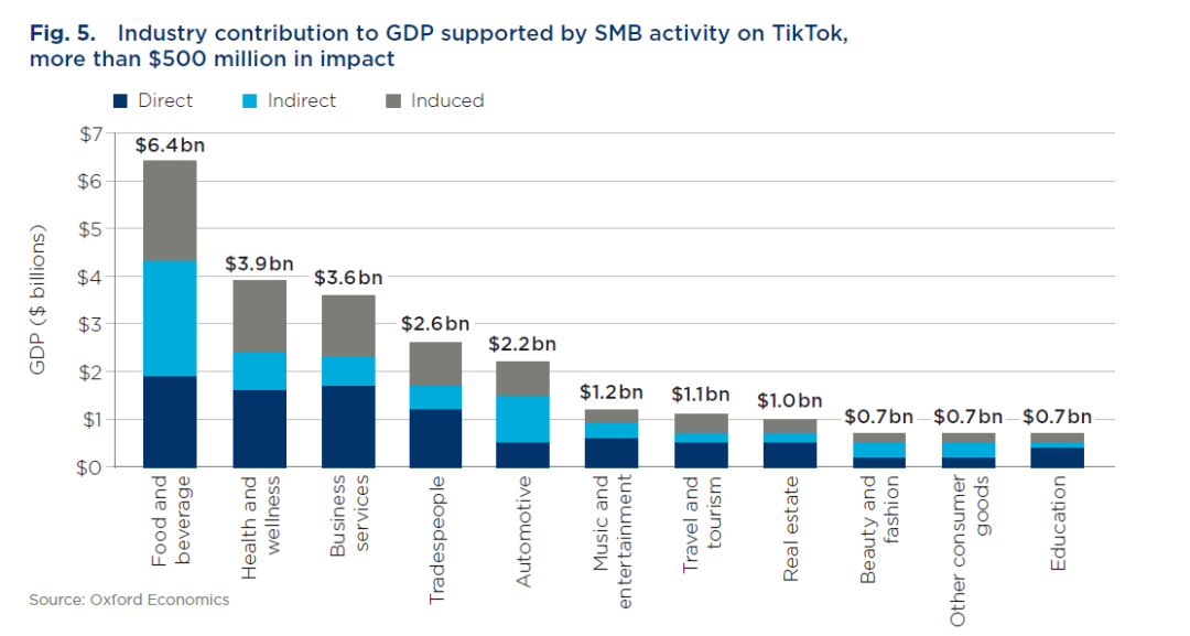 其次是健康与保健行业的中小企业,它们通过TikTok获得了39亿美元的GDP,并有效促进了就业增长。商业服务行业则以36亿美元的经济贡献紧随其后。