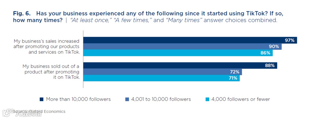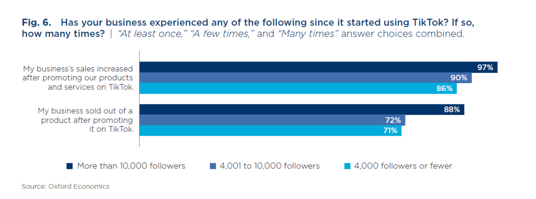 在询问产品在TikTok上推广后是否售罄或销售额是否有所提升时,调查发现,拥有4000名或以下粉丝的中小企业与粉丝数超过1万的企业之间,其差异并不明显。