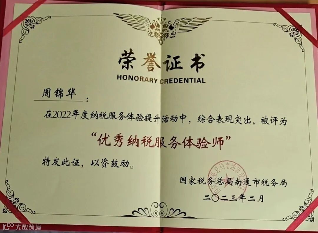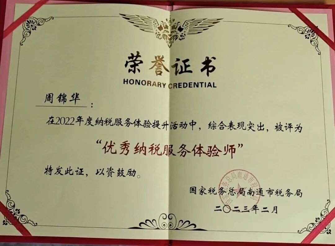国家税务总局南通市税务局于昨天在市税务三分局会议室举行了颁奖仪式,胤德(江苏)财税服务有限公司周锦华老师被评为2022年度优秀纳税服务体验师。