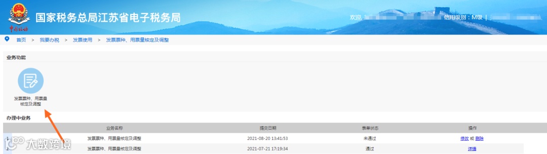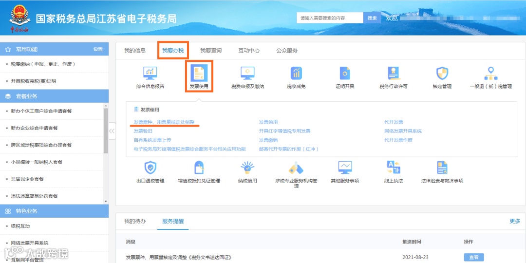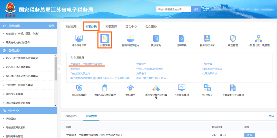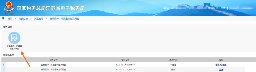 ●2.在首页依次点击〖我要办税〗 →〖发票使用〗→〖发票票种、用票量核定及调整〗,进入该模块。