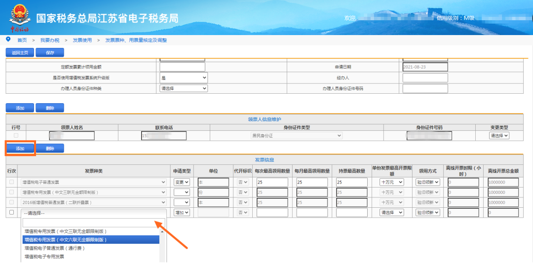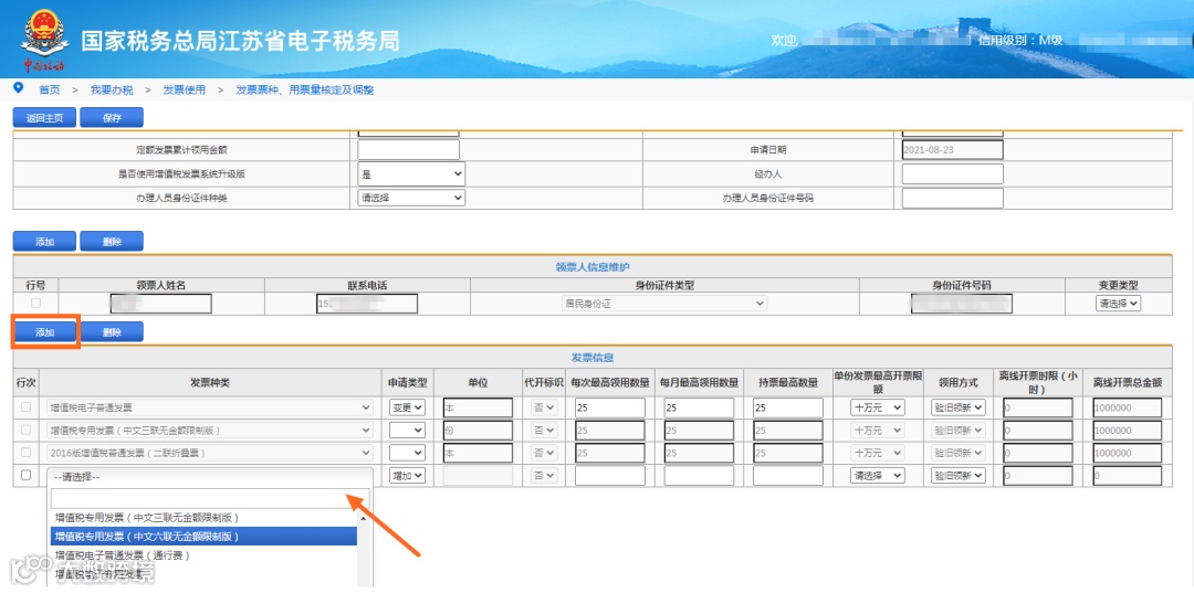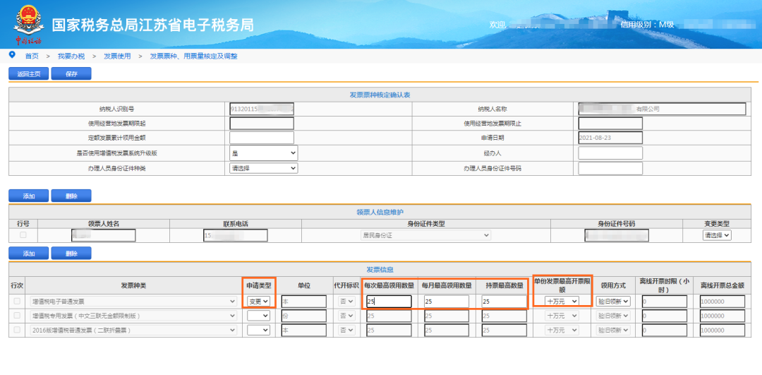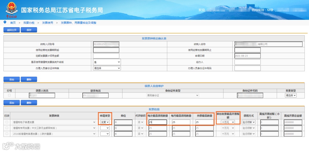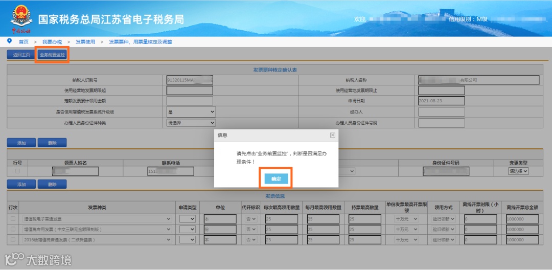●4.待“业务前置监控”按钮变为“保存”后,在确认表项下,录入办理人员等相关信息。“定额发票累计领用金额”一栏,如未领用过定额发票的纳税人请填写“0”。在发票信息项下,申请类型下拉选择“变更”,可根据企业实际生产经营情况申请调整发票数量及增值税普通发票“单份发票最高开票限额”。