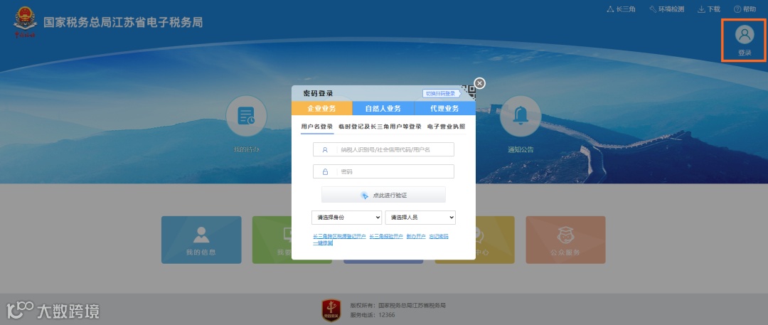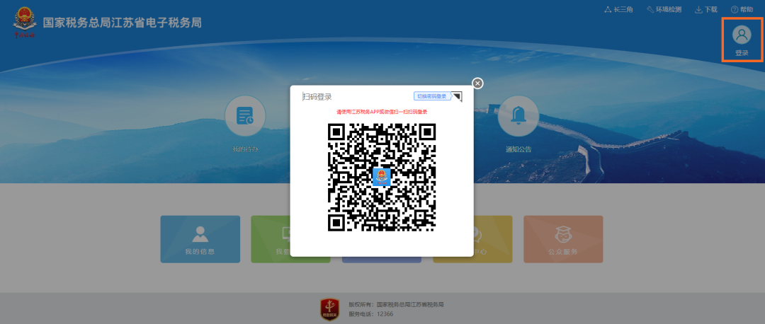 ●1.进入国家税务总局江苏省电子税务局首页,点击右上角登录,您可选择通过用户名登录或者使用“江苏税务”APP或微信扫码登录。