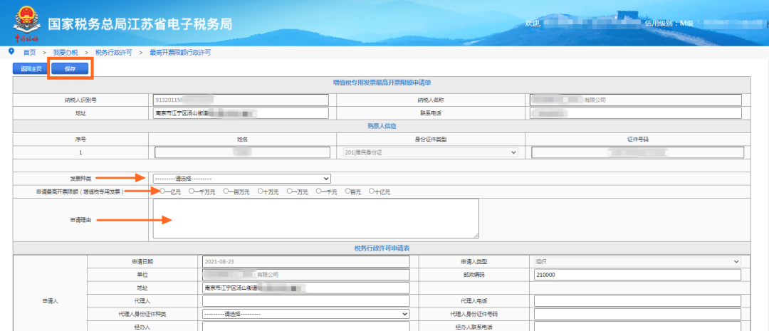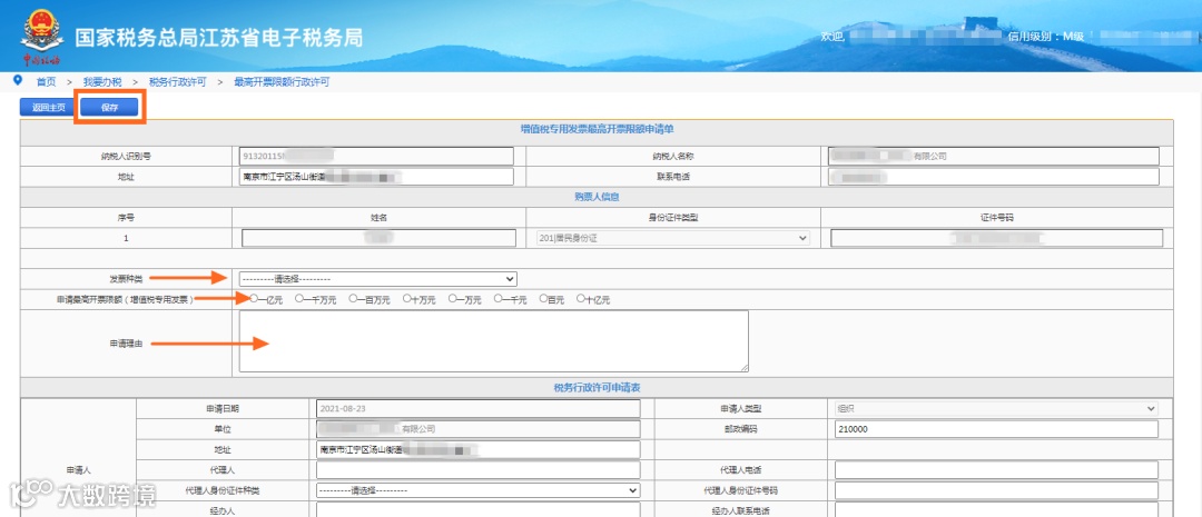 ●3.待“业务前置监控”按钮变为“保存”后,根据企业实际用票需求,填写表单相关信息,其中“发票种类”、“申请最高开票限额(增值税专用发票)”、“申请理由”以及经办人身份信息及联系方式等为必填项。表单填写完整,请点击左上角“保存”,提交成功后,流程将显示受理中。