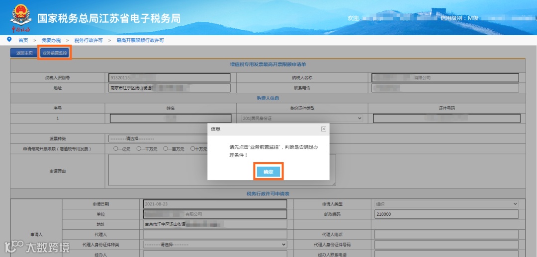 ●2.根据系统提示,请先点击 “业务前置监控”,判断是否满足办理条件。