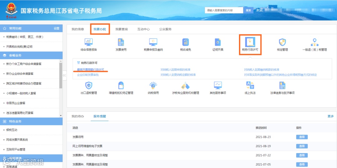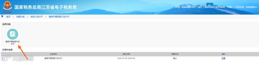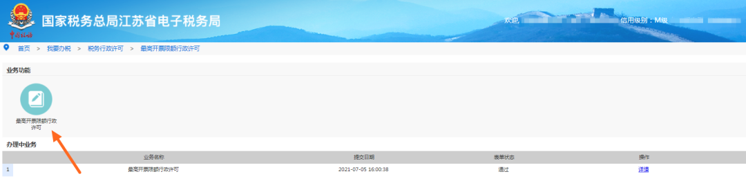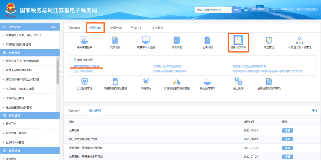 ●1.登录电子税务局,在首页依次点击〖我要办税〗→〖税务行政许可〗→〖最高开票限额行政许可〗,进入该模块。