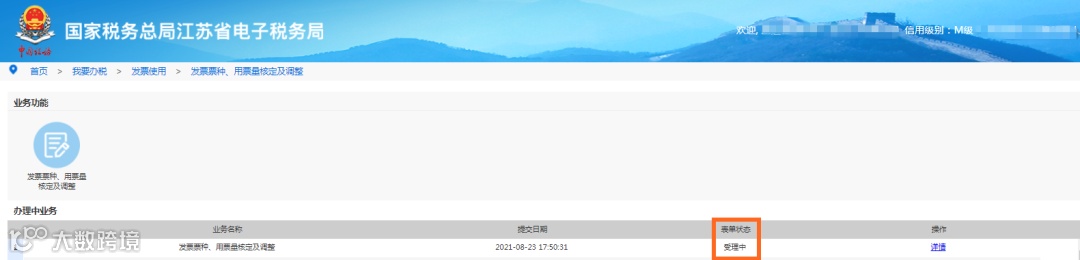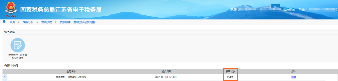 “受理中”表示涉税事项申请已被税务机关受理,尚未终审。通过增值税发票核定智能审核系统的智能审核时限一般为1个工作日,如转人工处理环节,请根据系统提示输入准确的联系方式等信息,税务机关将会与您联系,请您耐心等待。