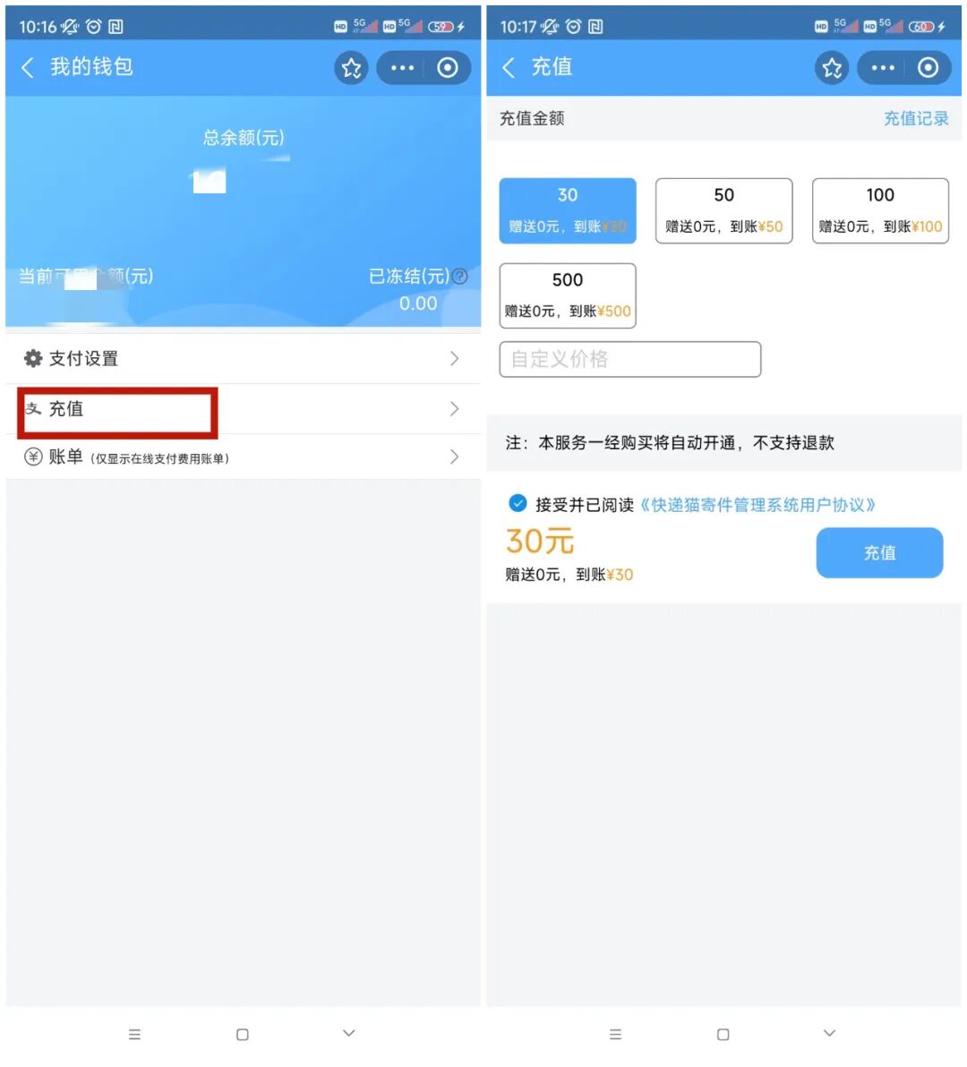 3、返回首页,点击【我的钱包】——【充值】,即可进行费用在线充值;