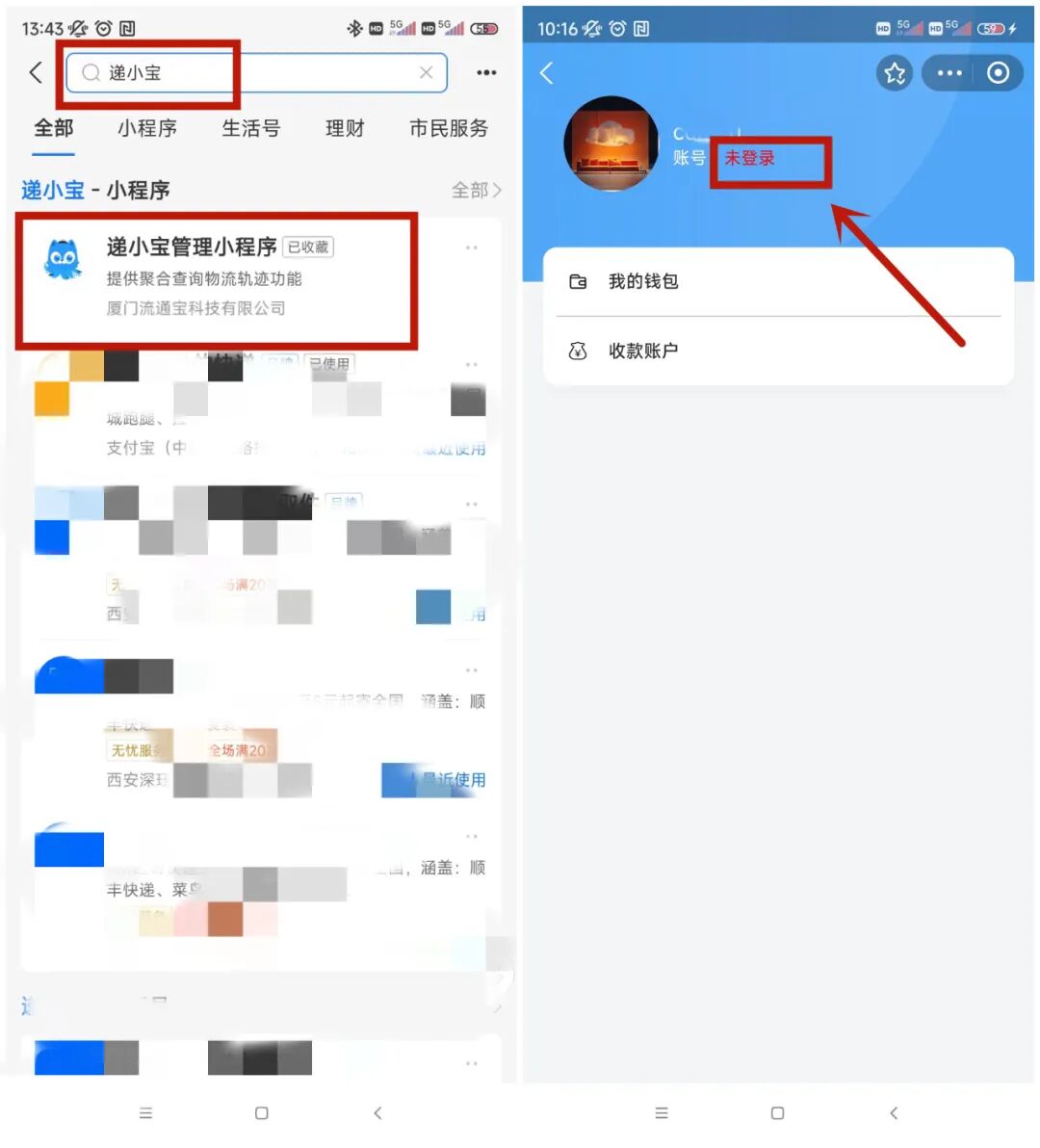 1、打开支付宝搜索“递小宝”小程序,进入应用后,登陆递小宝(或快递猫通用版)账号;
