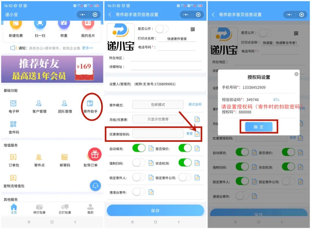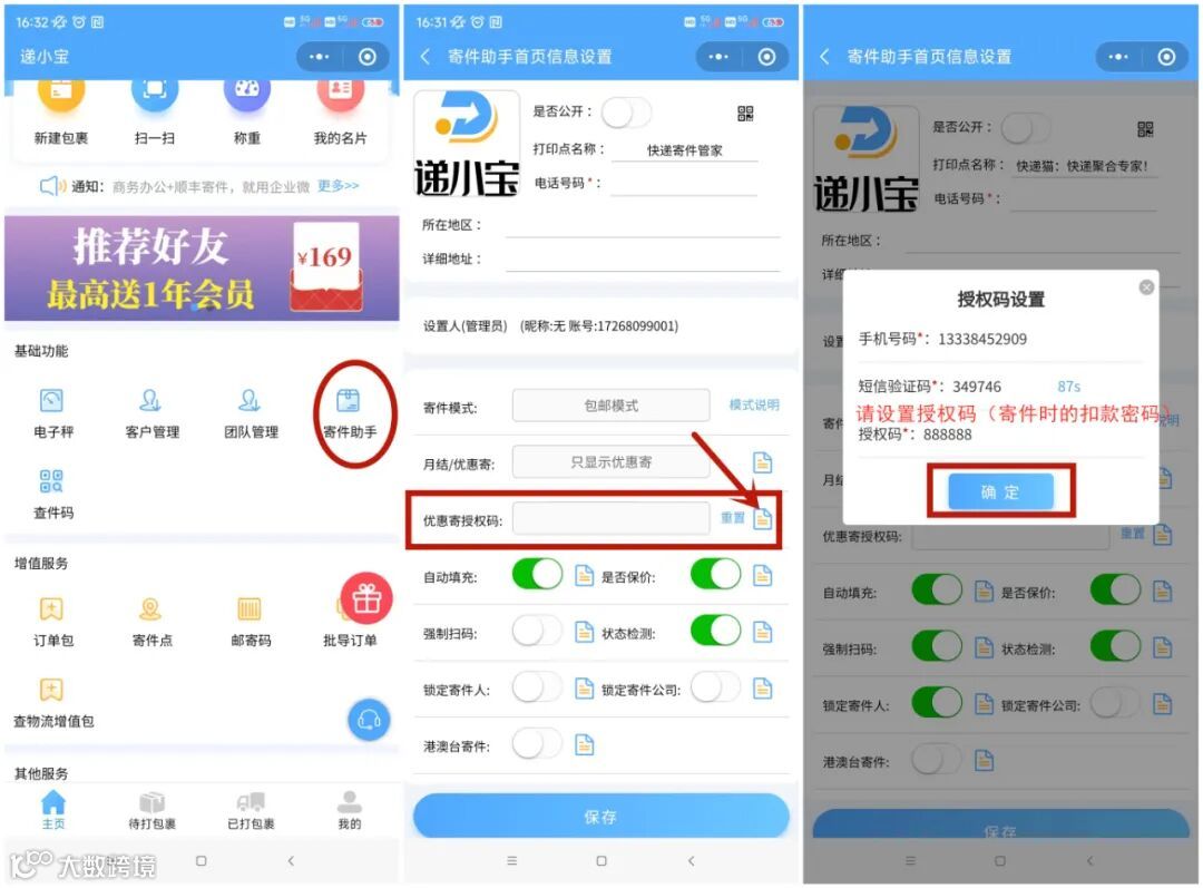 路径:进入递小宝首页 —— 寄件助手 —— 月结模式:只显示优惠寄 ——设置授权码;