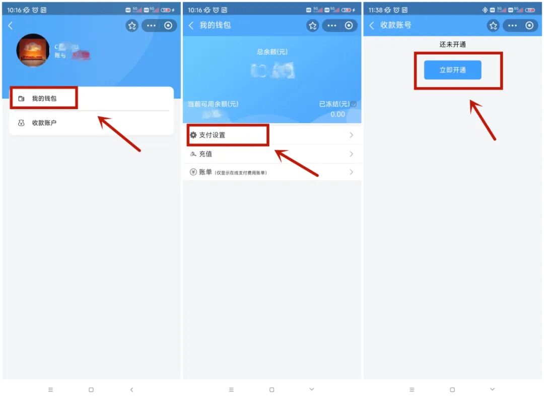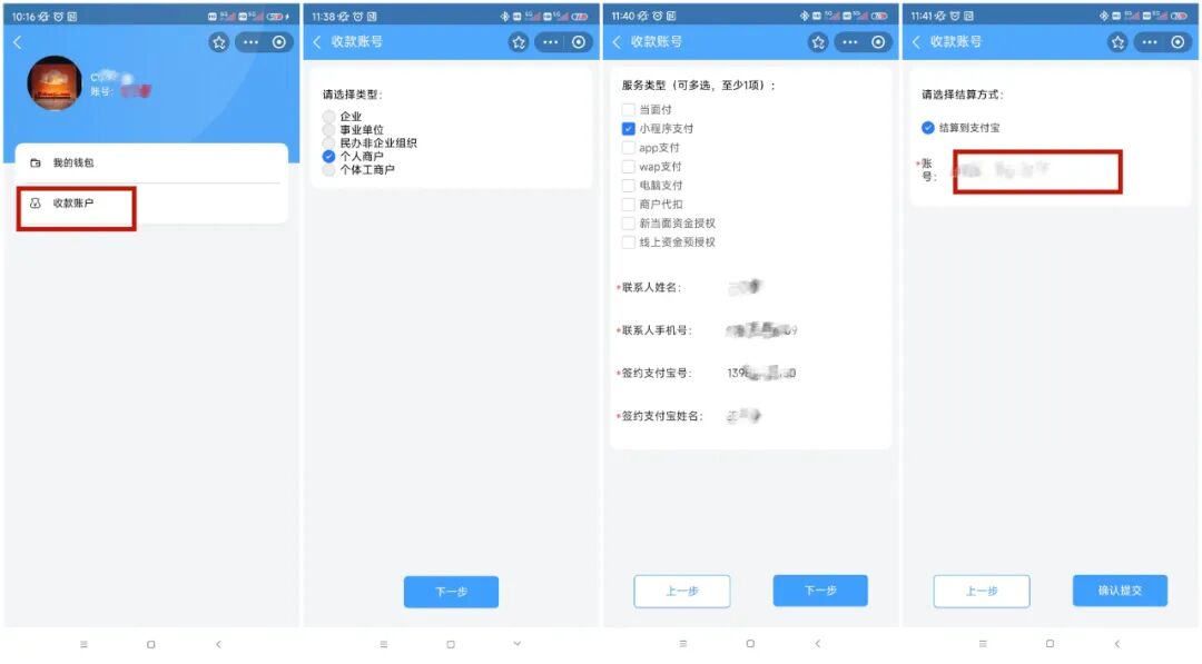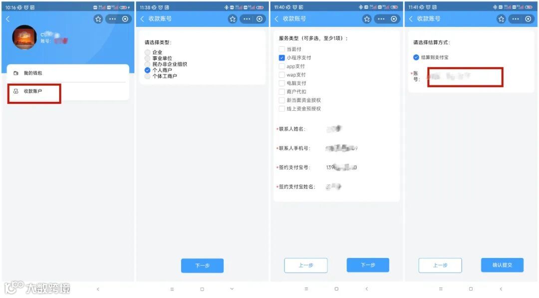 4、点击开通【收款账号】,按流程引导填写支付宝收款账号信息,等待后台审核;