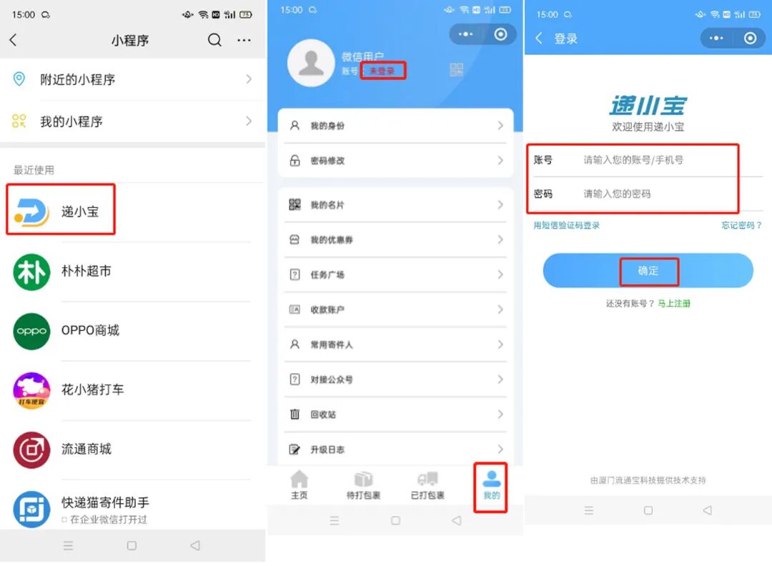 打开微信——发现——小程序——搜索【递小宝】小程序;点击【我的】——未登录——输入账号和密码登录。