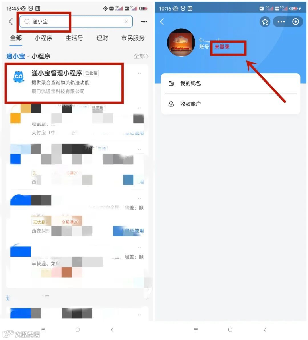 3、打开支付宝搜索“递小宝”小程序,进入应用后,登陆递小宝(或快递猫通用版)账号;