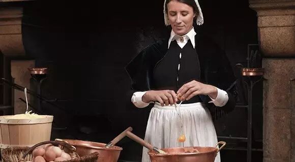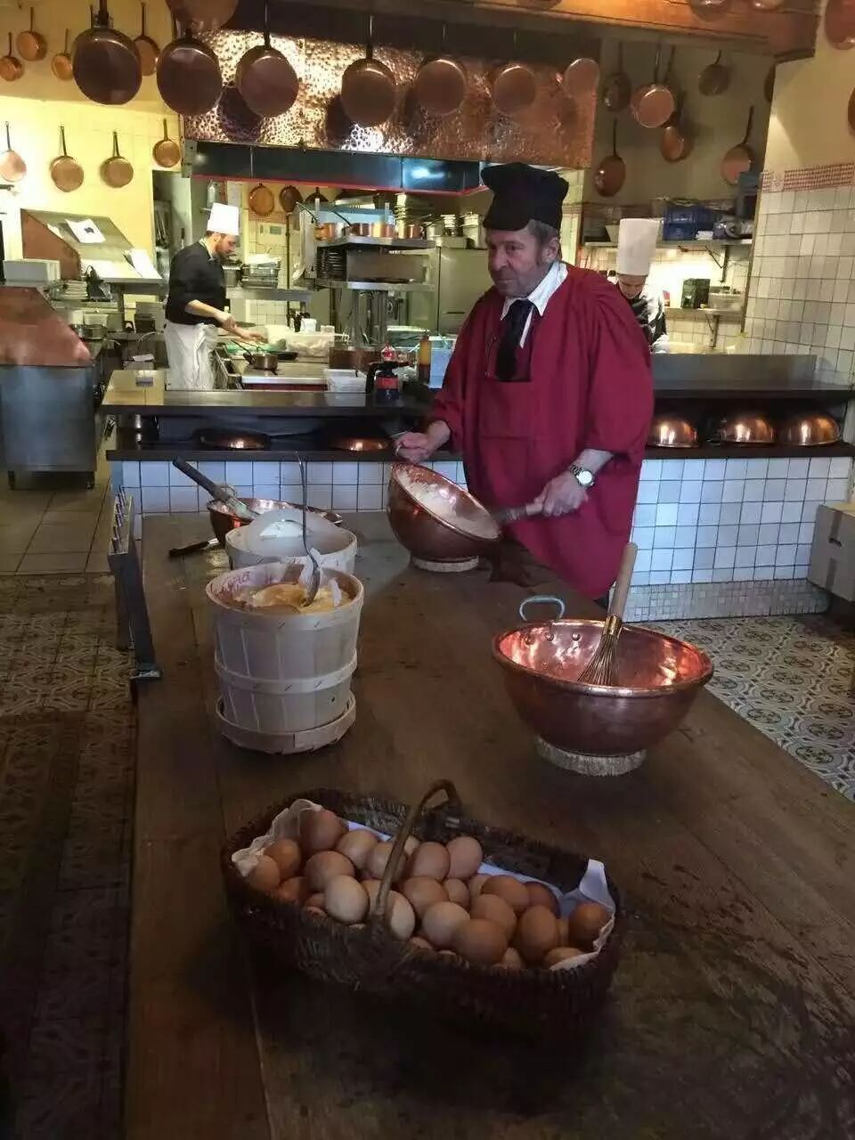 布拉妈妈鸡蛋饼用纯黄油,在长柄铜锅里,放在壁炉里的木火中煎制而成。随着一个华丽的翻转,落在餐盘里的煎蛋饼就成了两面金黄或者微白,中间的部分着糯糯的白色部分就叫做soufflée,也就是梳弗厘。