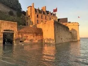 圣米歇尔山所处的圣马洛湾以涨潮迅猛闻名遐迩,最高潮与最低潮时海平面的落差高达15米。由于海湾深水区不多且底部平坦,退潮时大海距离岸边有15至20公里。通常涨潮的速度相当于一个人的步行速度—每小时4公里,顺风时速度则增加到每小时30公里。
