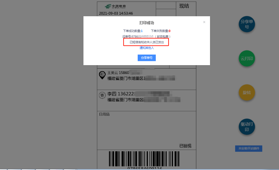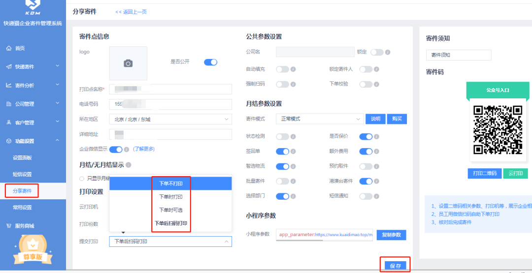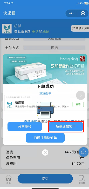 然后使用微信扫描寄件二维码或通过企业微信寄件助手进入下单页面,提交后系统自动给收件人发短信,也可以将单号分享给其他人/或发送短信,并支持重打和预览单号。