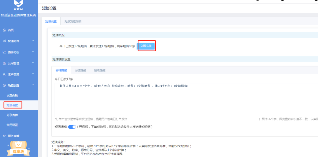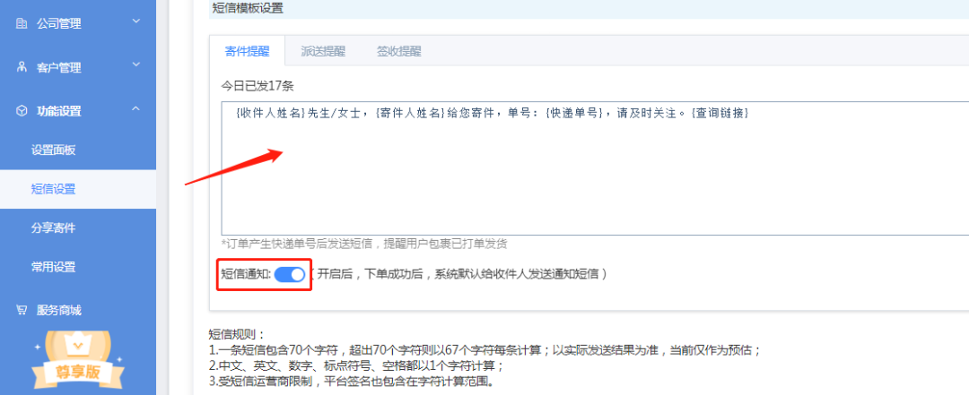 功能设置-->短信设置-->短信模板设置-->寄件提醒/派送提醒/签收提醒均可自定义设置模板内容;并支持各个状态提醒的开启与关闭。