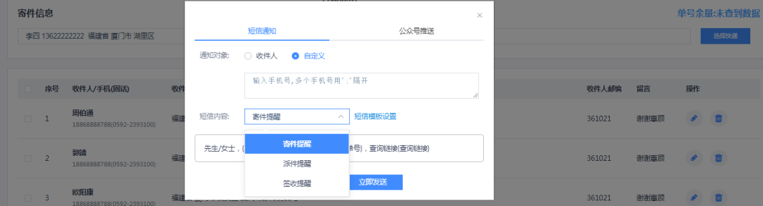 快递寄件-寄件填单/导入寄件/客户列表/寄件助手等入口下单都支持短信通知;也可以自定义给其他号码(非收件人)发送消息。