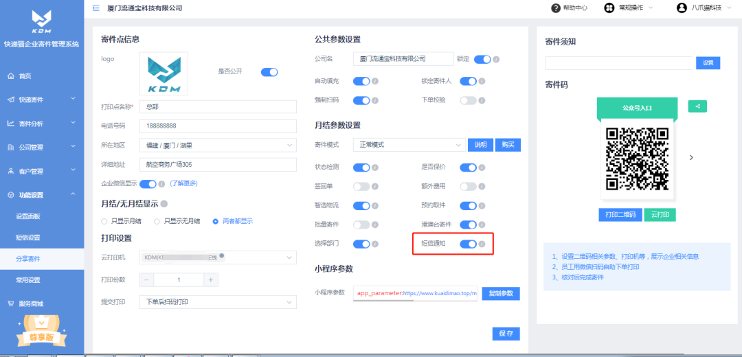 登录快递猫企业版-->功能设置-->分享寄件-->月结参数设置-->开启“短信通知”按钮。