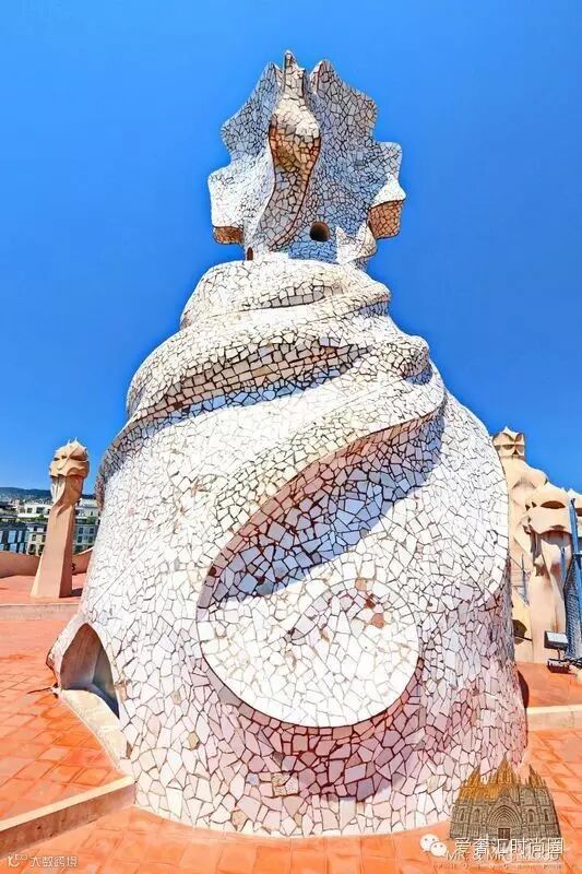 高迪还在米拉之家的房顶上造了一些奇形怪状的突出物,有的像披上全副盔甲的军士,有的像神话中的怪兽,有的像教堂的大钟。其实,这是特殊形式的烟囱和通风管道。