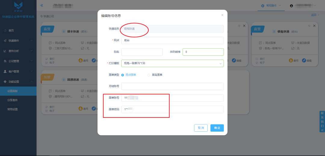 客户如与极兔快递有月结合作协议,仅需将申请的面单账号及密码添加配置到快递猫系统中即可实现在线下单寄件。