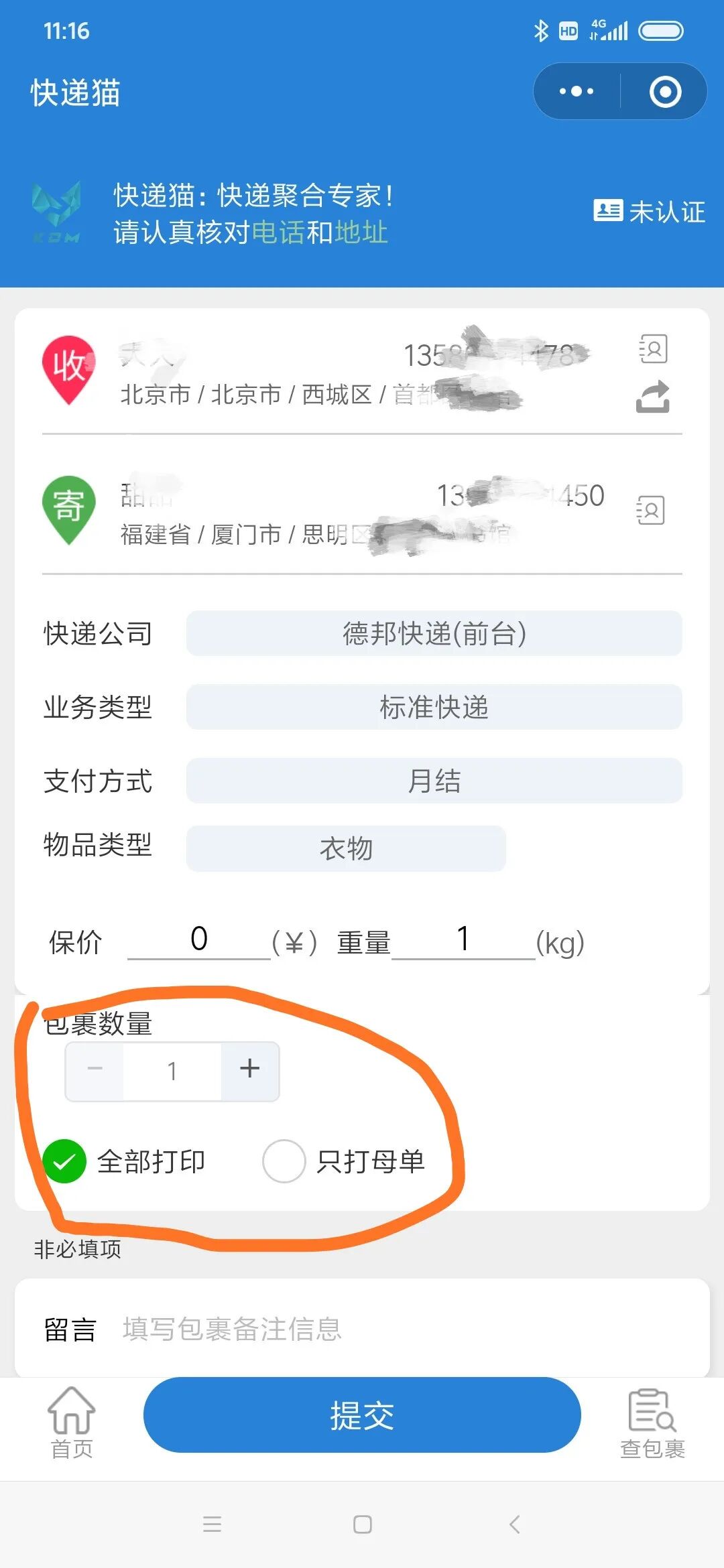 ②分享左侧的寄件二维码,员工填写收寄件人信息后,下单时即可填写多件包裹数量;下单多件包裹时,子母面单是否全部打印可自由选择。
