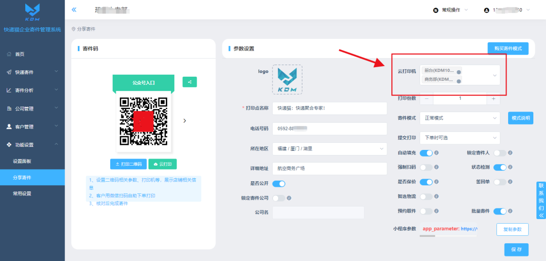 ①进入快递猫企业版管理后台,选择【功能设置】--【分享寄件】,在云打印机这边选择添加公司已有的打印机;