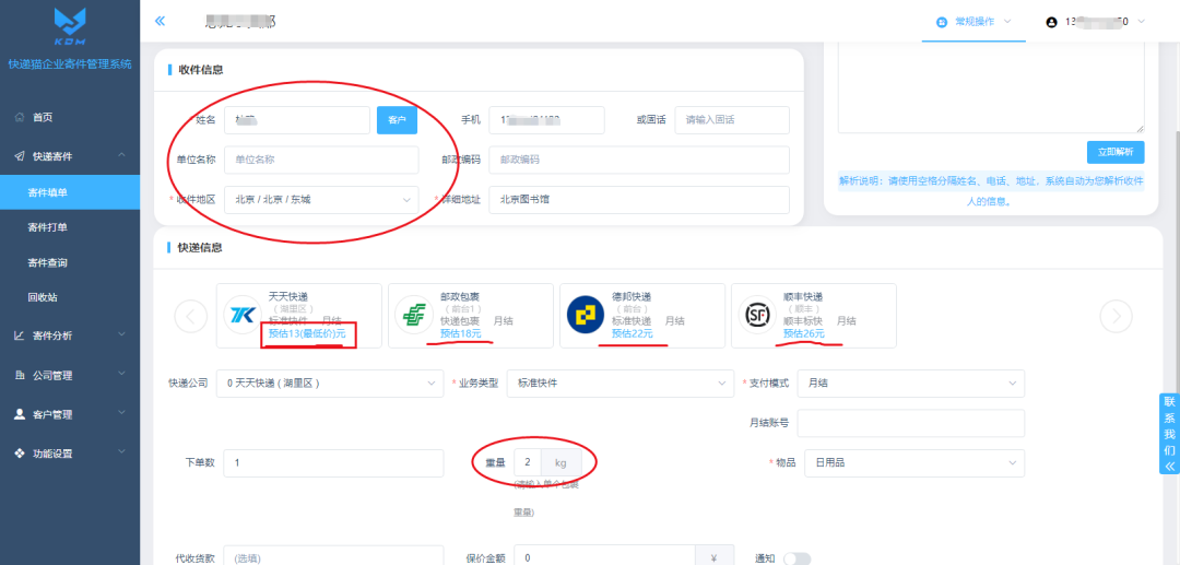 ②其次,在电脑端填写收寄件人信息后,寄件物品重量也输入完毕,各家快递公司会加载出预估的运费以供选择。