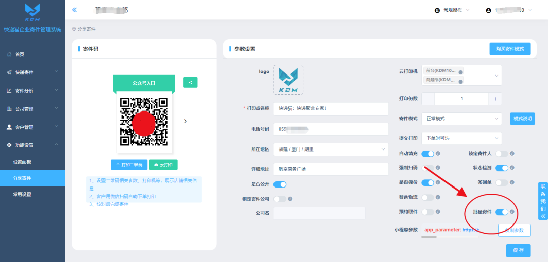 ①进入快递猫企业版管理后台,选择【功能设置】--【分享寄件】,打开【批量寄件】按钮,保存参数设置;