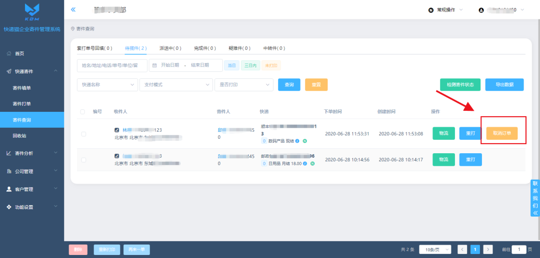 在【寄件查询】列表找到对应单号,点击右侧【取消订单】按钮,这一单将同步在快递系统中被取消,无需再联系快递员处理。