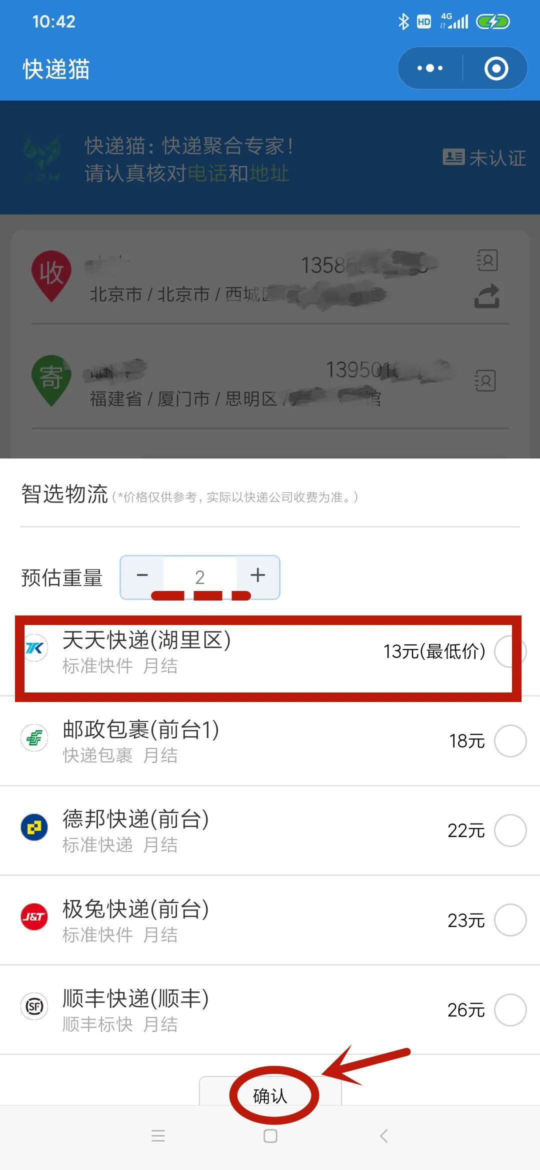手机端(小程序/H5),一样填写好收寄件信息及重量,同步会预估出运费,且推荐价格最低快递。