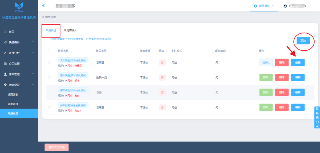 ①首先,需要到【设置面板】--【快递公司】,添加(月结协议)快递,以及对应的运费模板,然后到【常用设置】--【常用快递设置】对应设置常用快递参数;