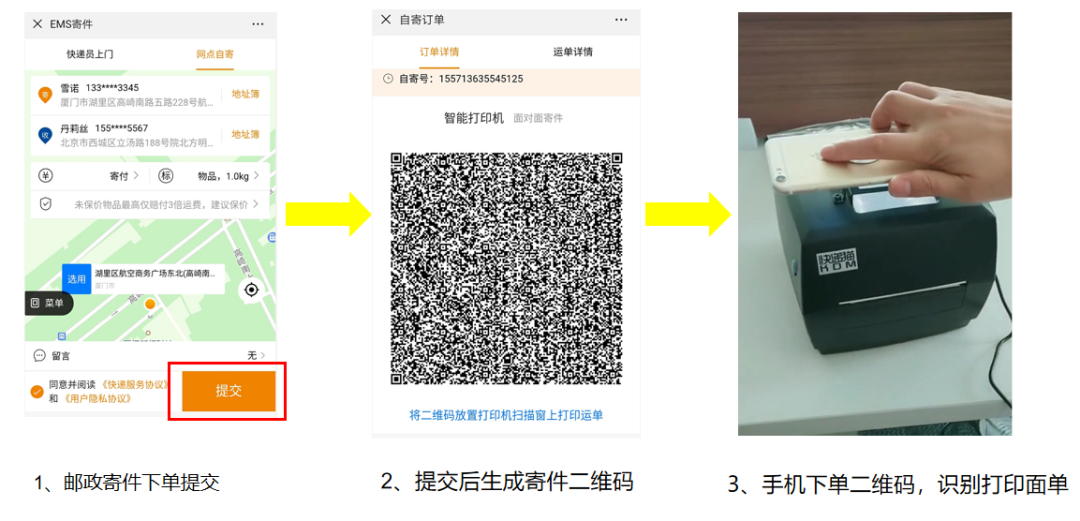 快递驿站作为末端派送寄放点,经常会遇到退换货寄件需求客户。这时候,可以结合快递猫小程序,实现客户自助扫码寄件,自助打印面单、贴单。