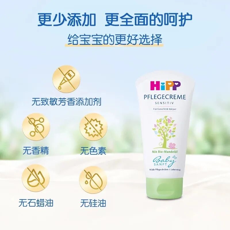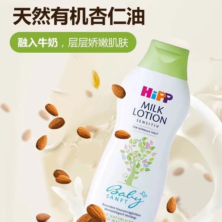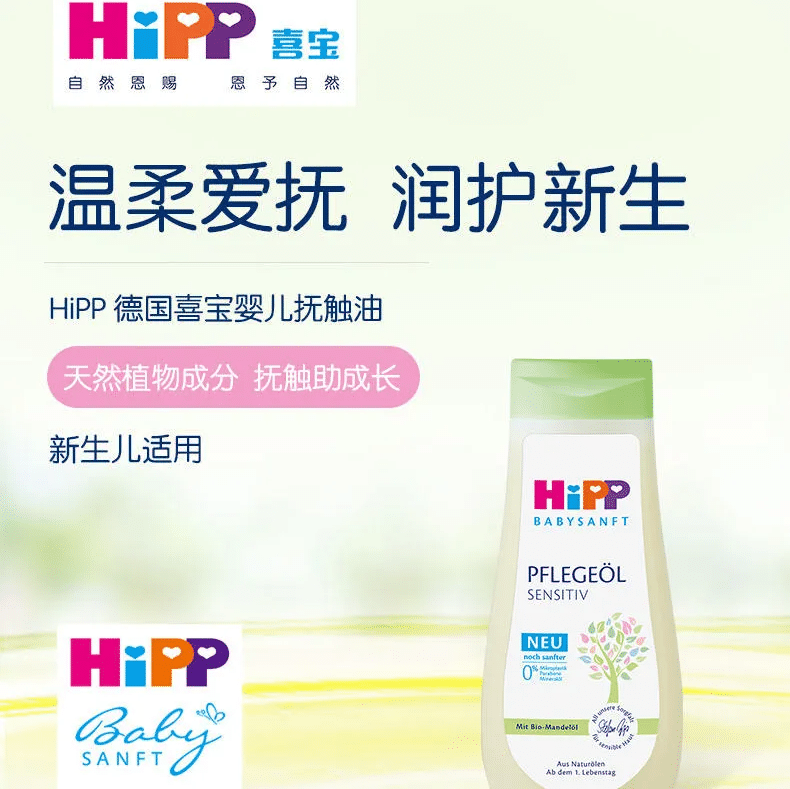 Hipp喜宝护肤系列所有的产品均不含矿物油,只含来自杏仁对皮肤亲和的天然成分,对宝宝皮肤的过敏风险降低到最低。